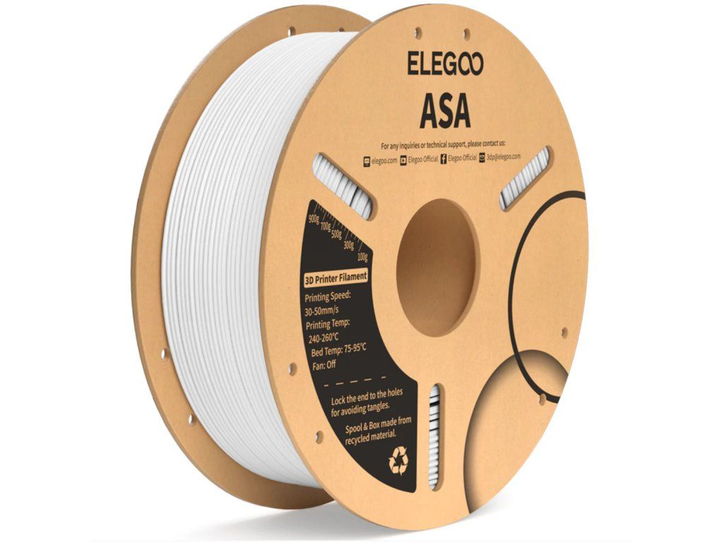 ELEGOO ASA filament je inženýrský materiál určený pro ty, kteří potřebují spolehlivé díly schopné vydržet náročné podmínky. Díky své pevnosti, odolnosti vůči slunečnímu záření, UV a vodě je ideální pro venkovní použití – například kryty, montážní části, zahradní doplňky, funkční komponenty, exteriérové montáže apod.