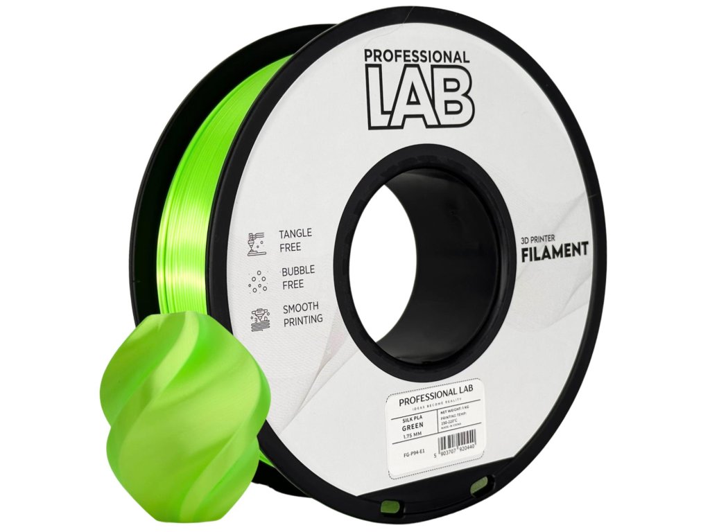 Silk PLA filament od Prof. Lab v sytě zelené barvě dodává výtiskům charakteristický hedvábný, lesklý povrch s efektem saténu. Tento materiál je ideální pro tvorbu dekorativních modelů, kde vysoký lesk zvýrazňuje detaily a dodává objektům luxusní vzhled bez nutnosti další povrchové úpravy.